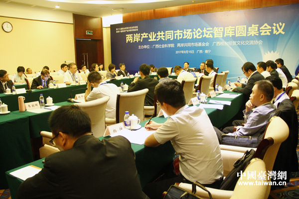 中國臺灣網9月15日廣西南寧訊 (記者 王怡然)9月15日下午,第十三屆桂臺經貿文化合作論壇分論壇——兩岸產業共同市場論壇智庫圓桌會議在廣西南寧舉行,來自中國社科院臺灣研究所、廣西社會科學院、南開大學、臺灣兩岸共同市場基金會、臺灣中華經濟研究院等研究機構和高校的50余名兩岸專家學者,就“加強民間交流,促進兩岸社會融合發展”等議題展開研討。