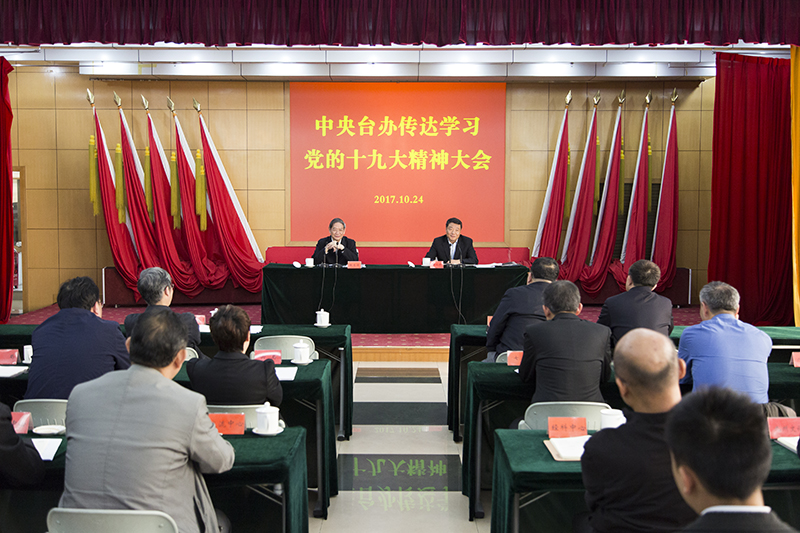 10月24日下午,中央臺(tái)辦召開傳達(dá)學(xué)習(xí)十九大精神大會(huì)。會(huì)議由張志軍主任主持,十九大代表、陳元豐副主任傳達(dá)黨的十九大精神并介紹了大會(huì)盛況。張志軍主任對(duì)中央臺(tái)辦認(rèn)真貫徹落實(shí)十九大精神作出動(dòng)員部署。辦領(lǐng)導(dǎo)、海協(xié)會(huì)領(lǐng)導(dǎo)、機(jī)關(guān)全體黨員干部和事業(yè)單位班子成員參加了大會(huì)。
