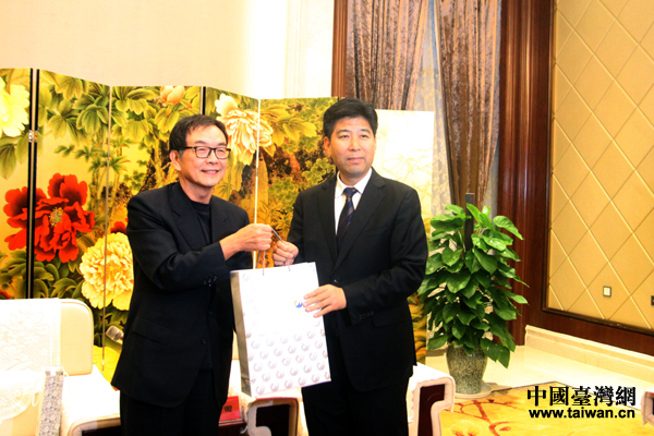 11月4日下午,江蘇省泰州市市委書記曲福田會見臺灣《聯合報》社長項國寧一行。雙方互贈禮物。(中國臺灣網 王怡然 攝)