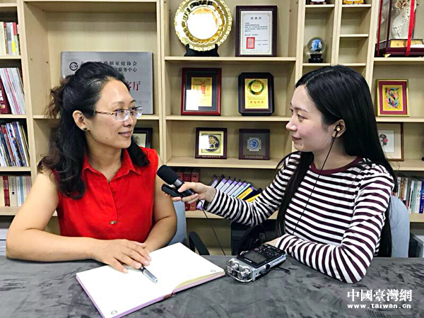 記者采訪海峽兩岸婚姻家庭服務中心交流聯絡部負責人郝紅梅(左)。