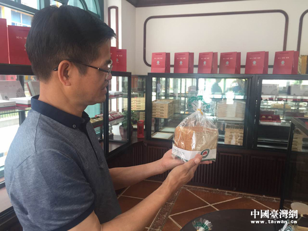 老臺商王江明1997年從臺灣淡水來到大陸,退休后在廈門開了一家面包體驗店。圖為王江明向記者介紹面包產品。