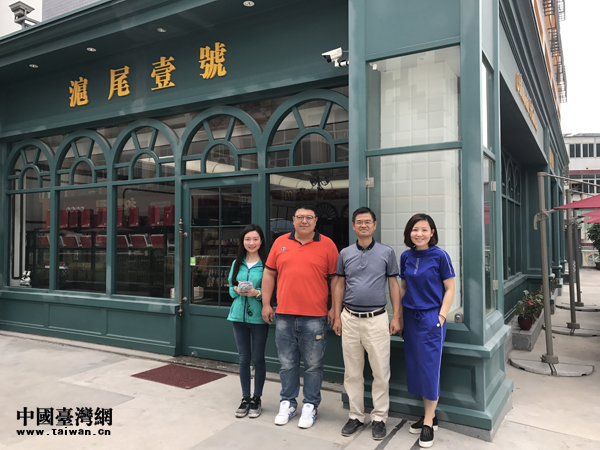 在大陸經營面包體驗店的老臺商王江明(右一)從高雄“三顧茅廬”請到了著名烘焙師鄧宇鈞(右二)來廈門一起做面包。圖為老少臺商接受央廣記者李金鑫(左一)采訪。