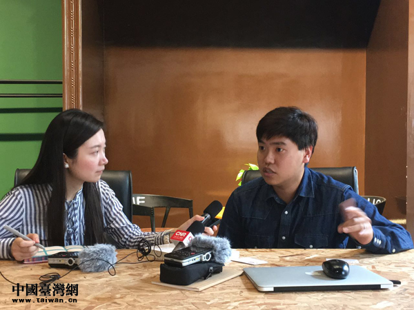 臺灣青年呂紹園(右)2016年放棄了原本薪水優沃的工作,帶著電子商務的夢想來大陸創業。圖為接受央廣記者李金鑫采訪。