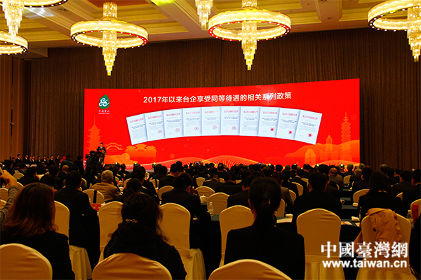 會上展示昆山市2017年以來臺企享受同等待遇的相關系列政策。(中國臺灣網 汪明珠 攝)