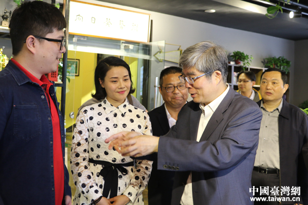 中共中央臺辦、國務(wù)院臺辦主任助理周寧與宿遷臺灣青年就業(yè)創(chuàng)業(yè)基地的兩岸青年交談。(中國臺灣網(wǎng) 張亞靜 攝)