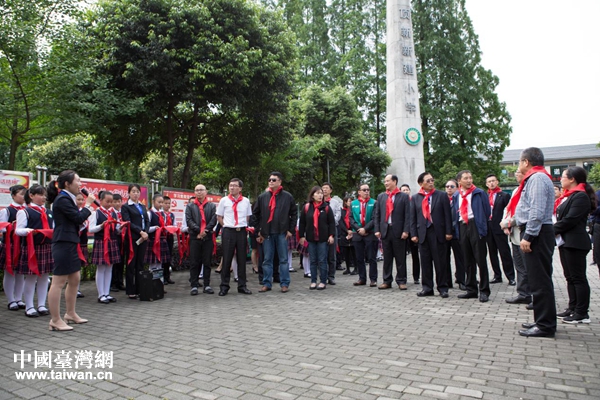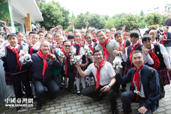 部分臺灣嘉賓與頂新新建小學同學合影留下難忘瞬間。(圖片來源:四川省臺辦)
