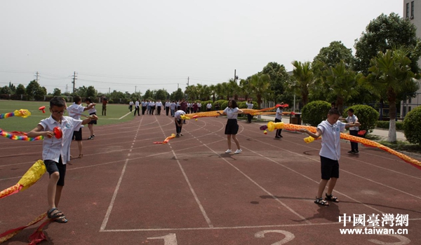 臺灣嘉賓參訪臺胞援建項目德陽什邡市隱峰中心學校觀摩學生體育課。(圖片來源:四川省臺辦)