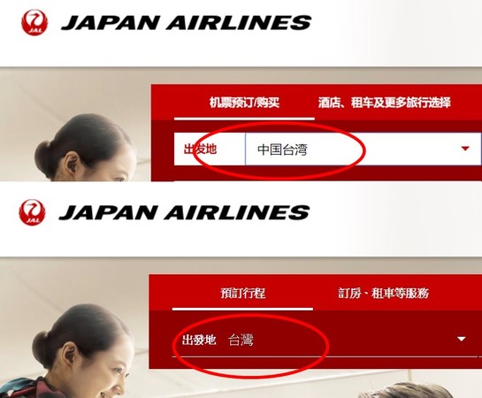 日本航空繁簡中文網站對中國臺灣地區的標注不一。(圖片來自日本航空官網)