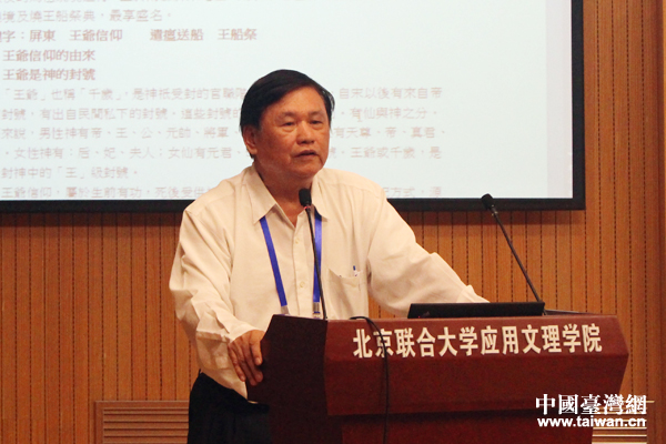 臺灣臺中科技大學應用中文系教授蕭登福圍繞“臺灣屏東地區的民間宗教信仰”進行主題發言。(中國臺灣網 張潔 攝)