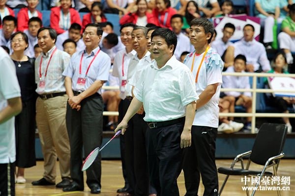 國務院臺辦副主任龍明彪為羽毛球賽開球。(中國臺灣網 盧佳靜 攝)