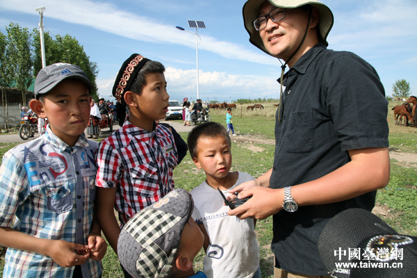 阿克奇村的孩子被臺(tái)灣航拍達(dá)人田欣云的無(wú)人機(jī)吸引。(中國(guó)臺(tái)灣網(wǎng) 王怡然 攝)