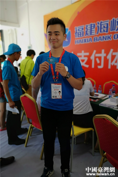 中國臺灣網8月11日福州訊 (記者 郜利敏 張露露)8月10日下午3點半,在海峽青年交流營地文化節B162,來自臺灣中國文化大學的大二學生林詮盛出示臺胞證,由中國移動公司和福建海峽銀行工作人員為其辦理大陸手機卡及銀行卡,然后在手機上下載支付軟件并綁定銀行卡開通支付功能。20分鐘后,他到隔壁超市使用移動支付消費,“真便捷!”