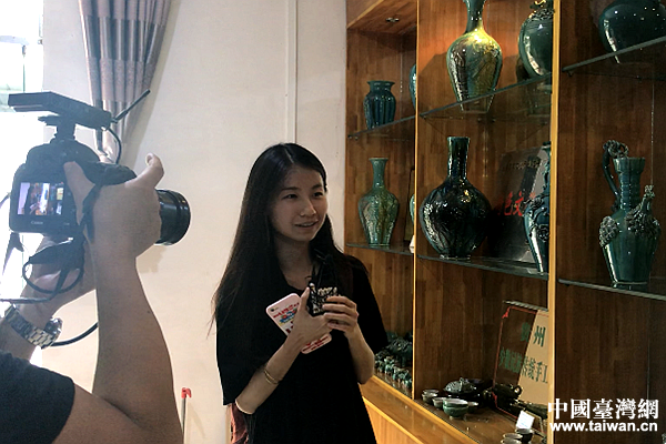 臺灣TVBS電視臺記者高嘉甫現場體驗牙舟陶制作過程。(中國臺灣網 張亞靜 攝)