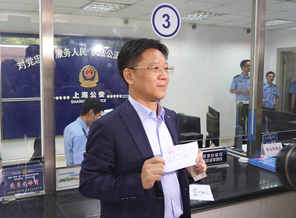 上海市臺(tái)灣同胞投資企業(yè)協(xié)會(huì)會(huì)長(zhǎng)李政宏提交居住證申領(lǐng)資料。(上海市臺(tái)辦供圖)