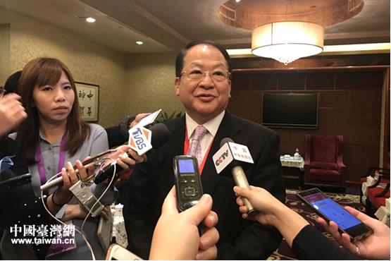 全國(guó)臺(tái)企聯(lián)榮譽(yù)會(huì)長(zhǎng)郭山輝接受兩岸記者采訪。(中國(guó)臺(tái)灣網(wǎng) 趙苗青 攝)