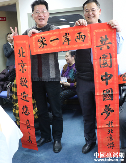 北京海峽兩岸書畫家聯誼會的書法家代表現場揮毫以書寫春聯的形式祝福在京臺胞及親屬,現場洋溢著歡樂喜慶的節日氛圍。在場的臺胞圍在書法家周圍,討論著字體和內容。“吉日生財豬拱戶,新春納福鵲登梅”、“國泰民安戌歲樂,糧豐財茂亥春興”、“北京歡迎您,共圓中國夢”一幅幅字體雋秀、筆法嫻熟、寓意吉祥的春聯呈現在灑金的紅紙上,引得在場者嘖嘖稱贊。