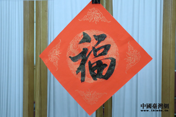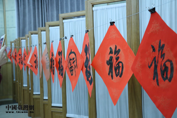 農歷豬年將至,活動現場一片祥和之氣,機關員工與書畫家們互動熱絡,互相祝福。書畫家們揮毫舞墨,真草隸篆,風格各異的“福”字躍然紙上!肮仓倌曛袊鴫簦c贊兩岸一家親!币桓备备桧瀮砂逗兔篮蒙畹膶β,蘊含著海峽兩岸同胞祈盼祖國統一的美好愿望和新年美好祝福。