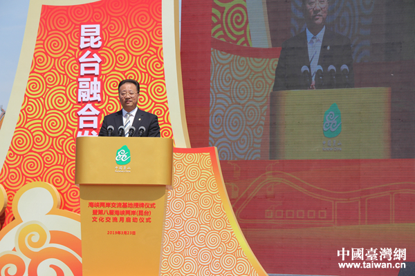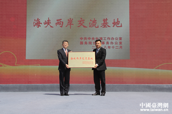 3月23日上午,昆山慧聚廣場“海峽兩岸交流基地”授牌儀式在當地舉行。圖為中共中央臺辦、國務院臺辦交流局局長黃文濤向昆山市授牌。(中國臺灣網 汪明珠 攝)