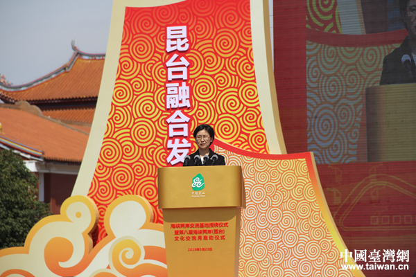 “昆山慧聚廣場是昆山與臺胞共同建設成果的代表。‘海峽兩岸交流基地’的授牌是我們工作的階段性的節點,是新工作的起點。”江蘇省臺辦主任練月琴在致辭中指出,希望兩岸同胞共同努力,真正把昆山打造成兩岸融合發展的試驗區、示范區 。