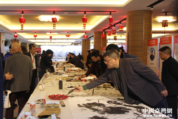 兩岸嘉賓參觀兩岸文化交流中心,欣賞書畫家現(xiàn)場創(chuàng)作。(中國臺灣網(wǎng) 汪明珠 攝)
