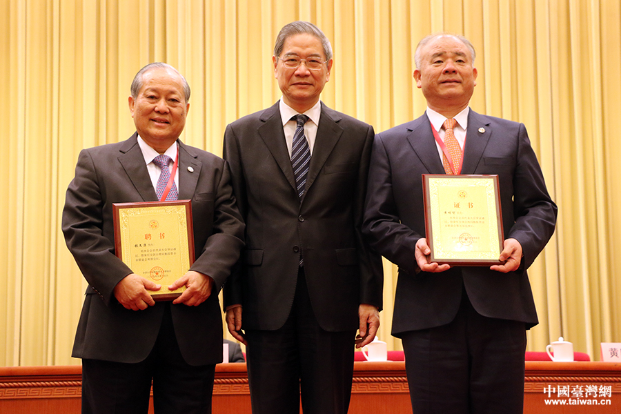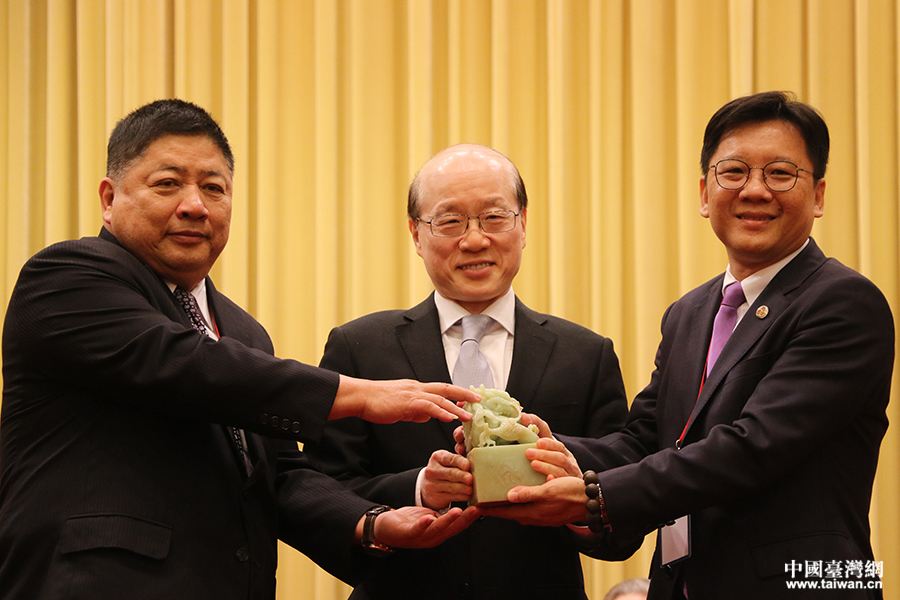 中共中央臺(tái)辦、國(guó)務(wù)院臺(tái)辦主任劉結(jié)一為第五屆會(huì)長(zhǎng)李政宏授印,為新任榮譽(yù)會(huì)長(zhǎng)王屏生授牌。(中國(guó)臺(tái)灣網(wǎng) 張潔 攝)