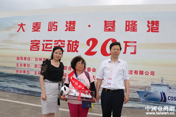 中國臺灣網5月25日玉環訊(記者 普燕) 5月25日下午,浙江省玉環市大麥嶼港旅客大廳人頭攢動,熱鬧非凡。玉環市領導和400多名兩岸旅客,共同見證和慶祝大麥嶼港對臺海上直航突破20萬人次這一具有歷史意義時刻的誕生。來自臺中的劉細妹成為第20萬人次幸運旅客。