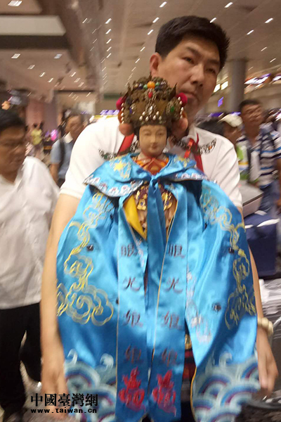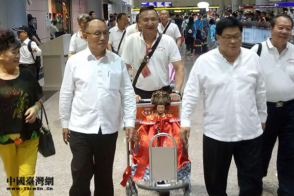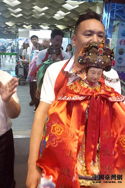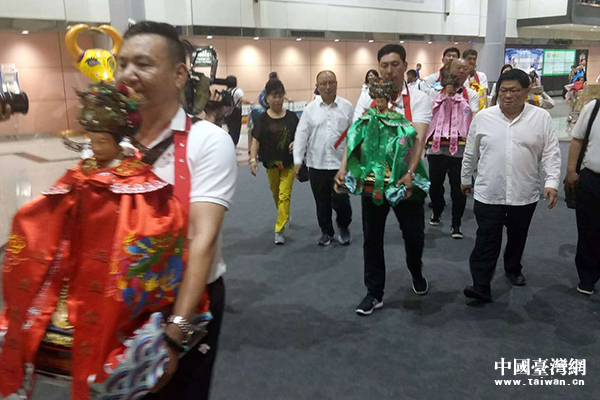 兩岸宮廟人士護(hù)送媽祖走出機場。(中國臺灣網(wǎng) 發(fā))