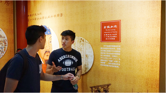 下午,營員們來到了南京云錦博物館。南京云錦是中國傳統的絲制工藝品,是國家首批非物質文化遺產,有“寸錦寸金”之稱。而南京云錦博物館是中國唯一的云錦專業博物館,館內展示了云錦織造工藝、明清云錦精品實物,以特殊的浮雕、鑲嵌技藝,表達出特殊的審美境界和文化藝術魅力,反映出中華民族特有的文化內涵。南京云錦所需要的特殊工藝,使其一直保留著傳統的提花木機織造的傳統,必須由兩人合作共同操作的高大織機吸引了兩岸青年的目光,大家紛紛站在手工織機前觀看云錦的織造過程,欣賞著這流傳一千六百余年的古老技藝。