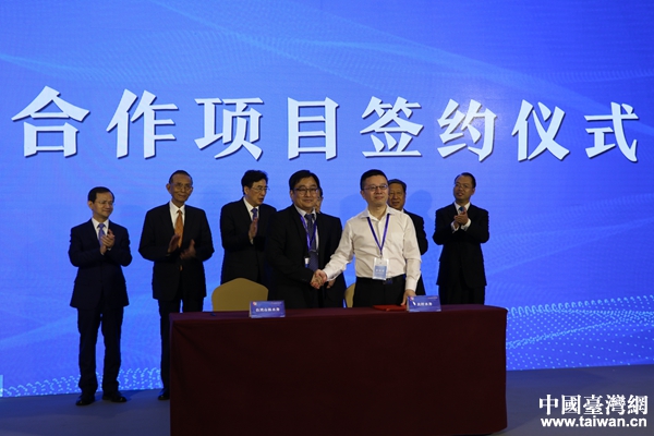 已達成合作協議的兩岸金融、保險及高新技術企業在簽約儀式上進行簽約,正式開展合作。(完)