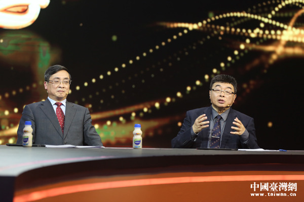 復旦大學中國研究院研究員、東南衛視《中國正在說》節目主持人鄭若麟(中)。(中國臺灣網發)