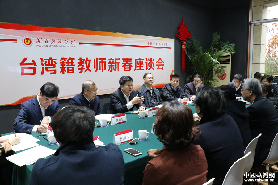 中共中央臺辦、國務院臺辦副主任龍明彪與湖北經濟學院臺籍教師座談交流。(中國臺灣網 李寧 攝)