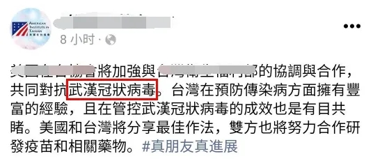 AIT這則新聞稿上稱呼“武漢肺炎”,民進黨當局第一時間回應,也稱呼“武漢肺炎”。原本,民進黨當局包括副領導人當選人賴清德、陸委會等,日前都已改口稱為新冠肺炎,對于中國大陸釋出善意。但美方主動拋出與臺灣在新冠肺炎疫苗的合作,拉近與臺灣的關系,臺灣方面緊跟美國態度,又稱回“武漢肺炎”,顯示美國對兩岸關系和緩發展扮演拉扯力量。