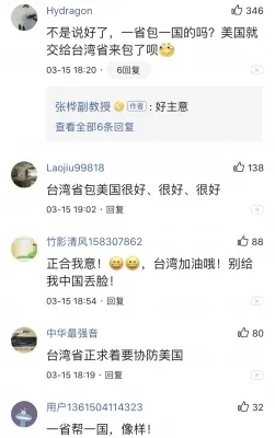 美方只要任何一個動作,民進黨當局就亦步亦趨,就算對兩岸關系有傷害,也沒有特別顧及。所以,這也就怪不得大陸網友要調侃、嘲諷“臺灣包美國”了。你都做得出,我還不能說兩句?當然,也有網民擔心,因為民進黨當局一心抱美國大腿,所謂的“合作”怕是又要拿臺灣當冤大頭。