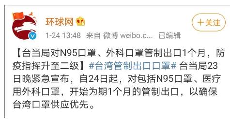 其二,就在今年1月底新冠肺炎疫情爆發之時,臺當局公告自1月24日起至2月23日止,為期1個月的期間,“紡織材料制口罩,過濾效果94%及以上者”(即N95口罩)及“其他紡織材料制口罩”管制出口。之后,在此前為期1個月的“口罩出口禁令”還未結束時,臺“經濟部”就已于2月13日宣布將禁令再度延長至4月底。