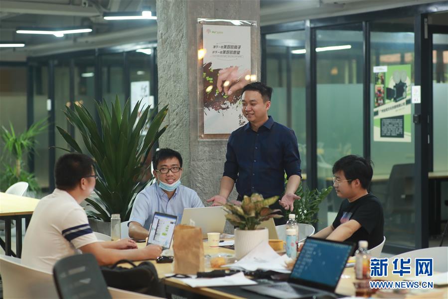 5月18日,陳鴻杰(右二)在匯龍臺港澳青年創新創業基地與工作人員討論工作。新華社記者盧燁攝