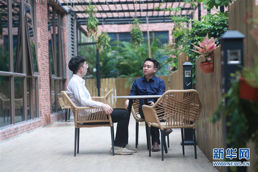 5月18日,陳鴻杰(右)在匯龍臺港澳青年創新創業基地與工作人員討論工作。新華社記者盧燁攝