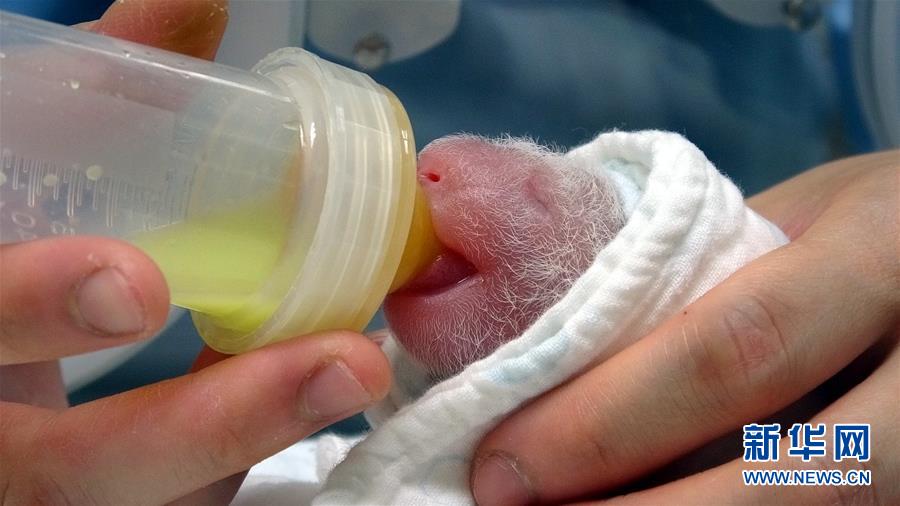 保育員喂大熊貓寶寶喝初乳(6月28日攝)。新華社發(臺北市立動物園供圖)
