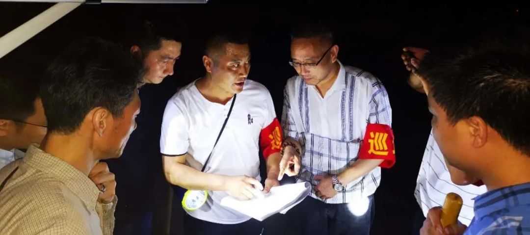 陳安(左五)正在認真核對當日白天巡查情況記錄表,做好晚間當值交接準備
