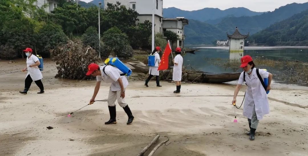 黃山支部主委張光是歙縣深渡醫院的骨科醫生,他看到洪水退去后當地防疫防病形勢嚴峻。在調研了解需求后,張光立即組織黃山支部盟員聯合歙縣第二人民醫院開展災后防疫防病工作,深入歙縣深渡鎮漳潭村進行災后現場防疫消殺,并給當地百姓普及健康防疫知識。臺盟安徽省總支副主委、秘書長王宇靖,副主委江良了解情況后乘火車趕來參加活動。