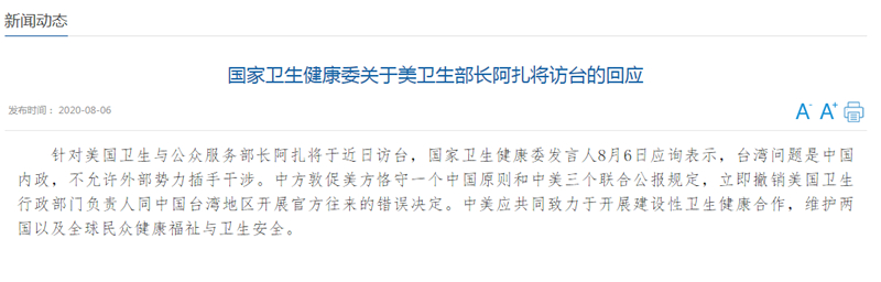 國家衛生健康委回應美衛生部長將訪臺