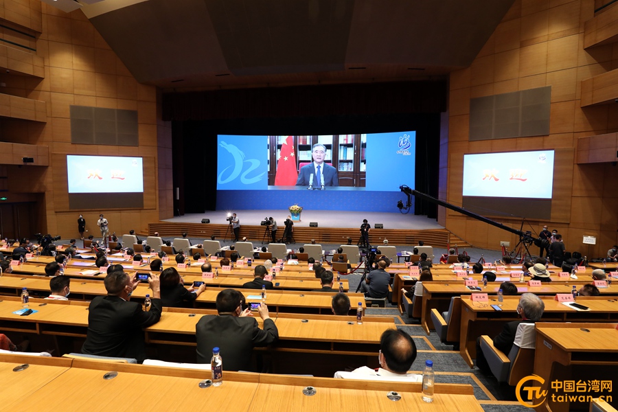 中共中央政治局常委、全國政協主席汪洋在大會上發表視頻致辭。(中國臺灣網 尹賽楠 攝)