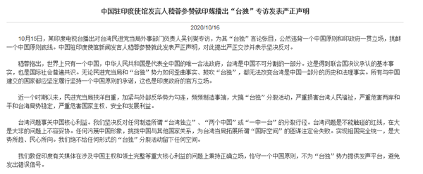 中國(guó)駐印度大使館就印媒播出“臺(tái)獨(dú)”專訪發(fā)表嚴(yán)正聲明