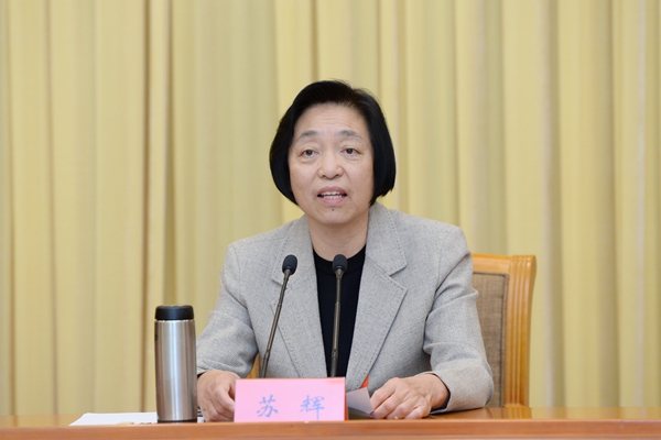 全國(guó)政協(xié)副主席、臺(tái)盟中央主席蘇輝代表臺(tái)盟第十屆中央常務(wù)委員會(huì)作工作報(bào)告。(臺(tái)盟中央宣傳部供圖)
