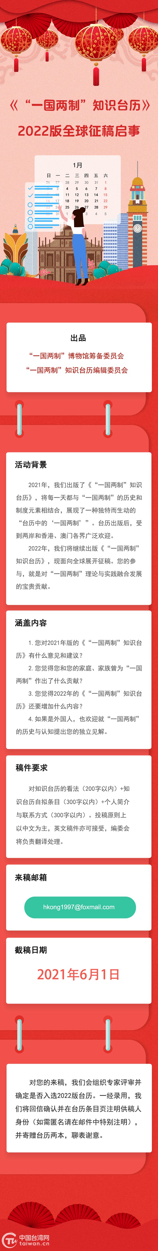 2022年我們將繼續(xù)編輯出版《“一國兩制”知識(shí)臺(tái)歷》。現(xiàn)面向全球征稿,您的參與就是對(duì)“一國兩制”與國家發(fā)展的寶貴貢獻(xiàn)。征稿范疇涵蓋如下內(nèi)容:您對(duì)2021年版的《“一國兩制”知識(shí)臺(tái)歷》有什么意見和建議?您覺得您和您的家庭、家族曾為“一國兩制”作出了什么貢獻(xiàn)?您覺得2022年的《“一國兩制”知識(shí)臺(tái)歷》還要增加什么內(nèi)容?同時(shí)也歡迎國際社會(huì)各界人士就“一國兩制”的歷史與認(rèn)知提出獨(dú)立見解。