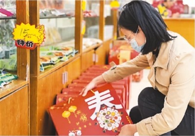 2月8日,在大嶝小鎮·臺灣免稅公園里,人們在挑選臺灣商品年貨禮包。
