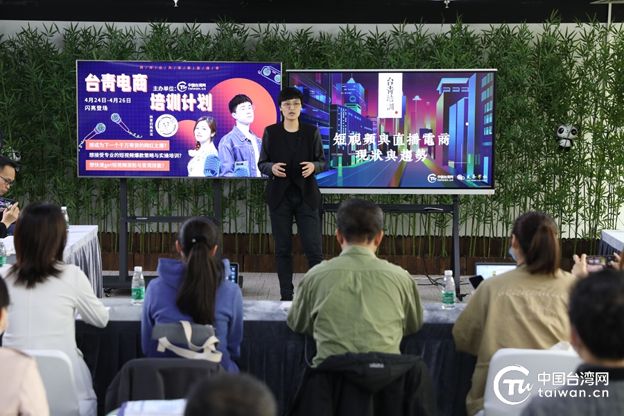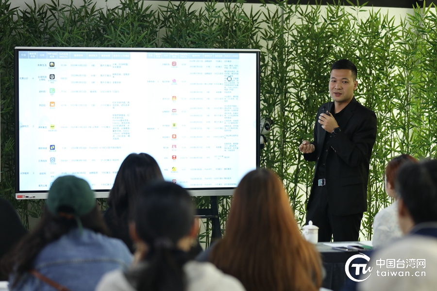 4月25日,由中國臺灣網舉辦的海峽兩岸古風茶裳直播季·臺青電商培訓進行中。圖為發條學社CEO、新媒體電商資深從業者金風介紹短視頻與直播電商現狀與趨勢。(中國臺灣網 張亞靜 攝)