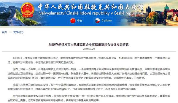 中國臺灣網(wǎng)4月30日訊 據(jù)中國駐捷克大使館網(wǎng)站消息,駐捷克使館發(fā)言人29日就捷克議會參議院炮制涉臺決議發(fā)表談話指出,4月28日,捷克議會參議院炮制涉臺決議,要求捷克政府支持臺方參與世界衛(wèi)生組織所有會議、機制和活動。這嚴重違背捷方一個中國政治承諾,粗暴干涉中國內(nèi)政,中方對此表示強烈不滿和堅決反對。