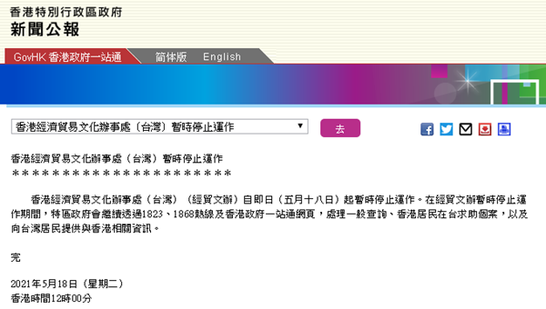 港府公報:香港經(jīng)濟貿(mào)易文化辦事處(臺灣)暫時停止運作