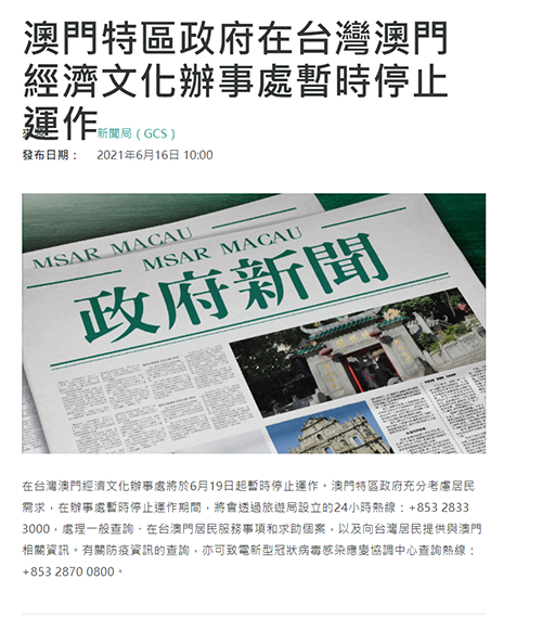 中國(guó)臺(tái)灣網(wǎng)6月16日訊 繼香港之后, 在臺(tái)灣澳門經(jīng)濟(jì)文化辦事處將于6月19日起暫時(shí)停止運(yùn)作。