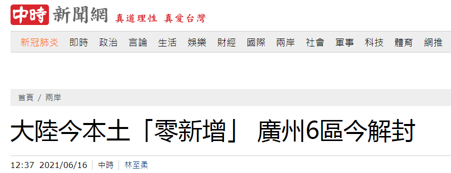 臺灣中時新聞網(wǎng)稱,大陸16日新增21例確診,均為境外輸入病例,本土“零新增”。廣州近日本土疫情嚴(yán)重,所幸15日并無再新增本土確診病例或無癥狀感染者。此外,廣州全市有6個封閉封控區(qū)域達(dá)到解封條件,并提出解封申請,經(jīng)專家評估,已獲廣州市防控指揮部同意。